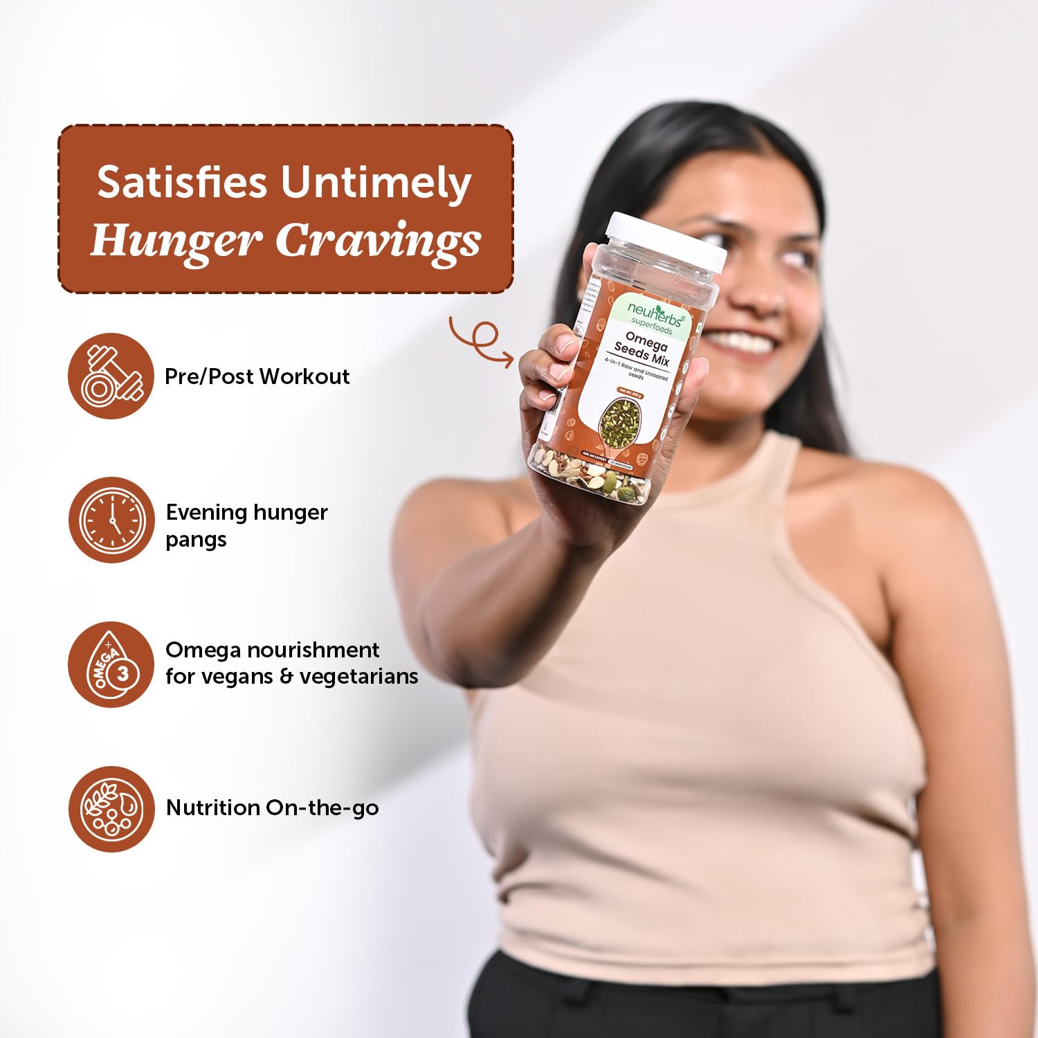 Powerhouse of Omega-3 Fatty Acids- neuherbs Omega Mix is power packed with Omega-3’s. This omega seeds mix is a 4-in-1 mix of Flax, Pumpkin, Watermelon & Sunflower seeds with a rich amount of omega 3.